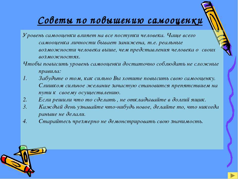 Значит, и ответ на вопрос, каким образом повысить самооценку и уверенность в себе, будет однозначным. Благоприятное условие, чтобы повысить степень оценки самого себя — реализация в профессиональной сфере, насколько позволяют таланты.