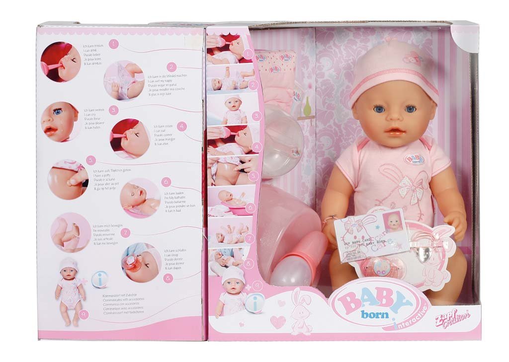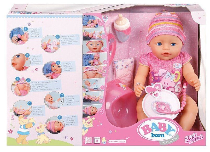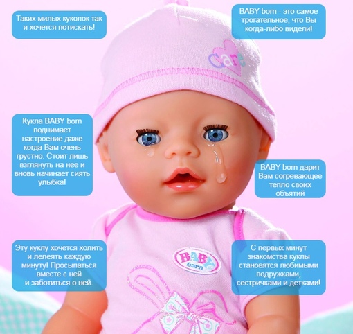 Для этого нужно использовать только чистую воду, вставить носик бутылочки поглубже в рот куклы (чтобы открылся специальный питьевой клапан). Потом сжимать бутылку, кукла начнет пить. Очень важно — поить куклу можно только в вертикальном положении, иначе вода сразу окажется в подгузнике.