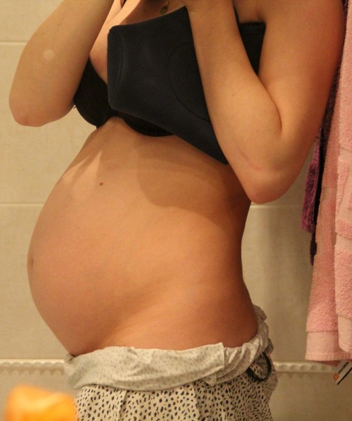Начинается III триместр беременности. Матка стоит на высоте 29-30 см, вам становится труднее дышать. Сейчас может развиться одно из самых серьезных осложнений — токсикоз второй половины беременности, который характеризуется появлением отеков, повышением артериального давления и появлением белка в моче. Для ранней диагностики этого осложнения необходимо тщательно наблюдаться врачом акушер-гинекологом и соблюдать все его рекомендации, в т.ч. строгий контроль веса. В III триместре беременности суточная прибавка веса должна составлять не более 50 г, т.е. не более 300 г в неделю. Следует также следить за соотношением выпиваемой и выделяемой жидкости.