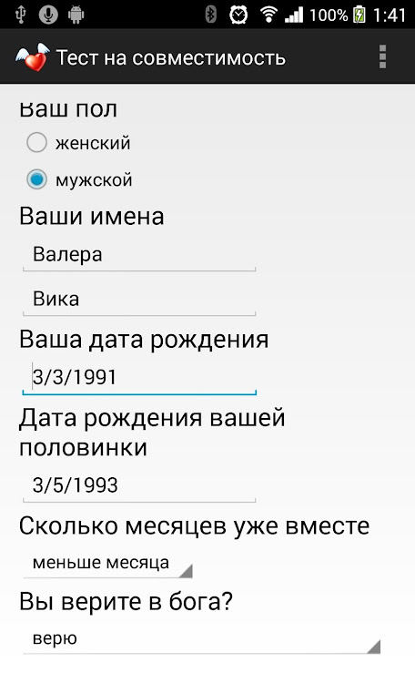 Для расчета процента совместимости между вами и вашим партнером достаточно требуются имена вас и вашего партнера.Введите данные выше и быстро знать результаты, которые могут принести положительные изменения в вашей личной жизни.