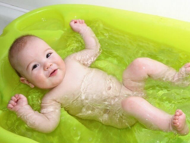 В ванночку с водой можно добавить пенку или хорошо пенящийся гель, это должно заинтересовать кроху.