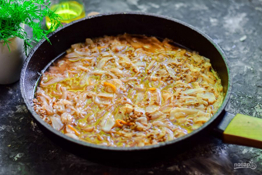 - В толстостенную посуду налить масло и потомить его вместе с тмином несколько минут. Затем выложить лук и помешивая потомить под крышкой. Капусту квашеную обдать кипятком и слегка отжать. Грибы залить кипятком, чтобы набухли.