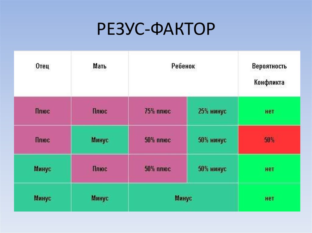 Будущие мама и папа, как известно, могут иметь разные резус-факторы крови. Если оба из родителей резус-положительные, то и ребенок, как правило (в 75 % случаев), наследует положительный резус-фактор. При наличии резус-отрицательной крови у обоих родителей, ситуация складывается аналогично, ребенок в данном случае будет рожден с резус-отрицательным фактором крови. В случае, если у мамы положительный резус-фактор, а у отца — резус-отрицательный, никаких осложнений при беременности не возникнет.
