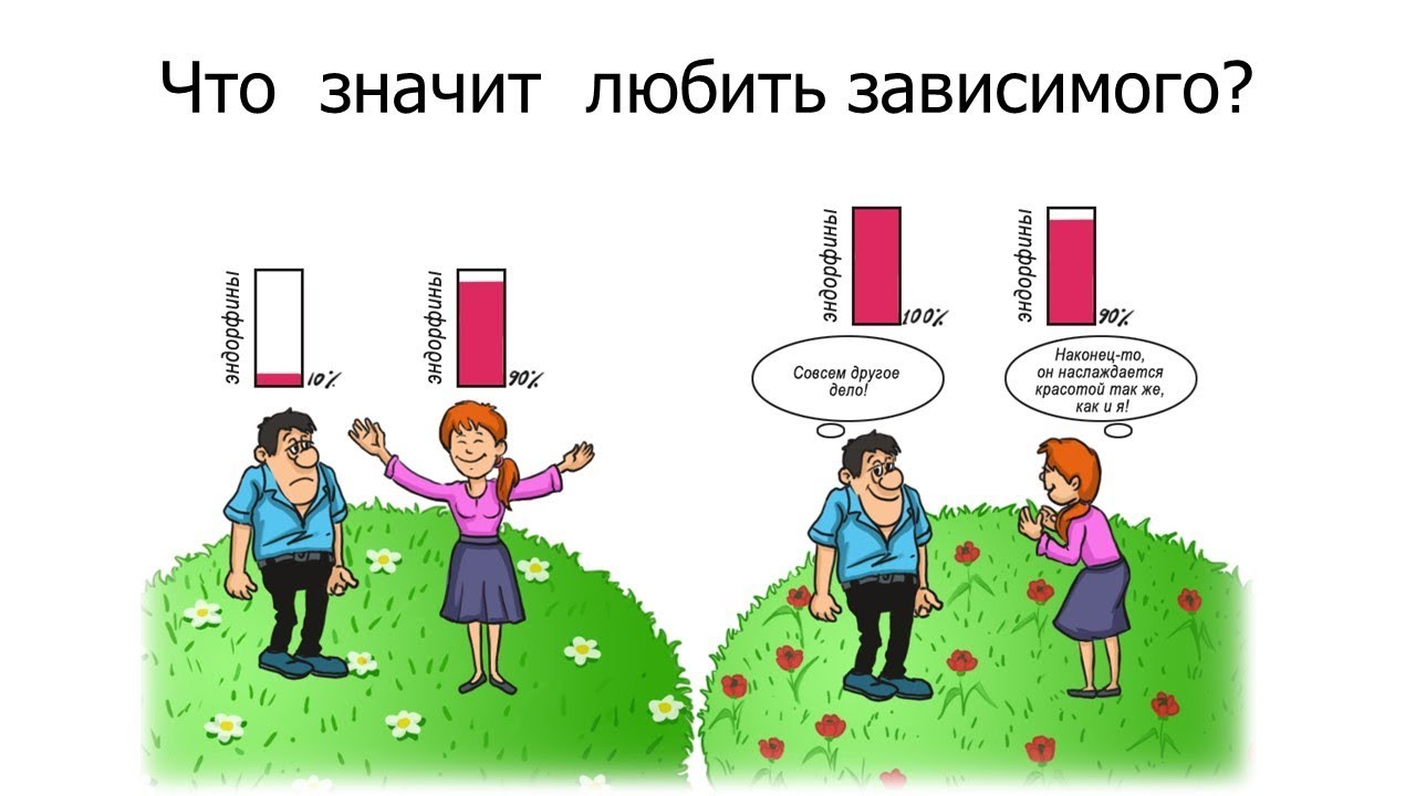 Все же песни об этом: «Я не могу без тебя жить!». Однако, состояние, когда человек страдает из-за отсутствия чего-то внешнего, называется зависимостью. Вы любите не человека, а чувства, которые возникают в его присутствии. Это в лучшем случае — влюбленность, когда мы почти ничего не знаем о ком-то, но нам нравится приподнятое состояние, вызванное знакомством.