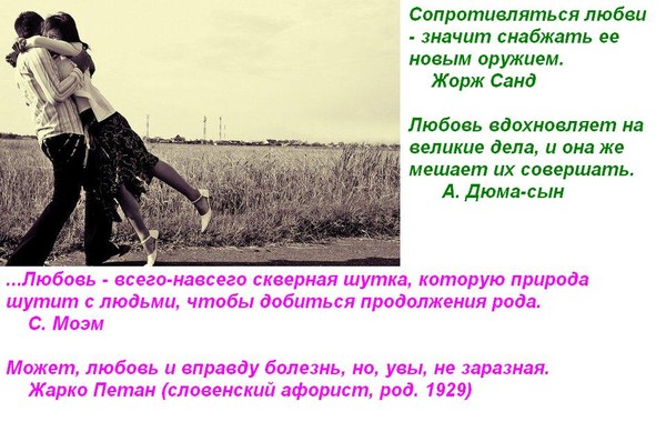 А всё остальное — это сюсюканье и «розовые сопли». И не более. Грош цена всем этим сюсюканьям, тогда как любовь есть сила, мощь, есть проявление воли и решимости человека. Это, если угодно, больше похоже на черту характера, нежели на чувство.