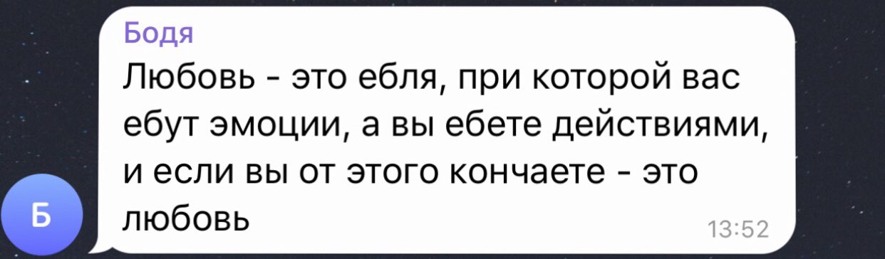 «Разные есть виды любви, и те, что настоящие, которые мы чувствуем всем телом, душой, сердцем. Ну и есть немножко ненастоящие, которые в других местах ощущаются… Такие ощущения обжигают, а не греют, и довольно быстро заканчиваются. Для меня эталон любви – это то, что Бог испытывает к нам (простите, атеисты), весьма близко к этому то, что мы испытываем к своим детям или воины в бою чувствуют по отношению к соратникам.