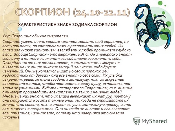 Скорпион так устроен, что он долго накапливает яд, прежде чем излить его на кого-нибудь. Представители этого знака часто сами страдают из-за своего характера, но изменить почти ничего не могут. Планета-покровитель Марс оказывает сильное влияние на формирование взглядов Скорпиона.