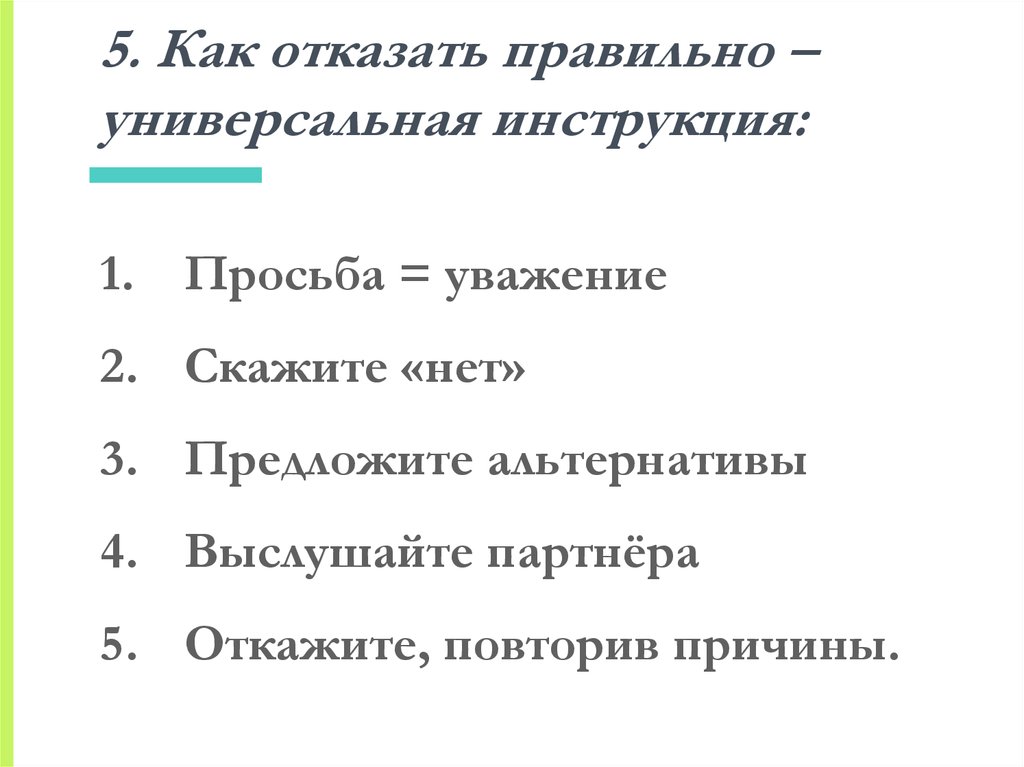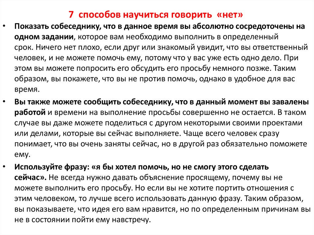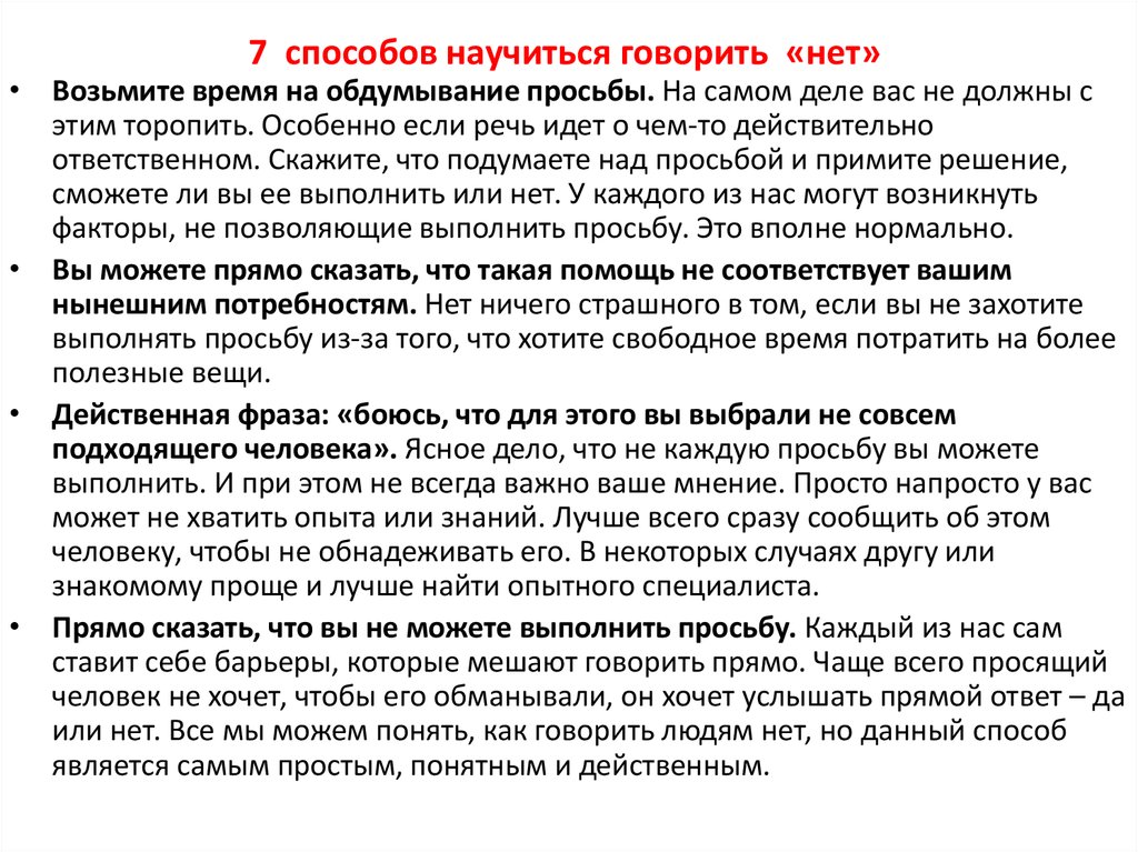 Поэтому лучше не фантазировать, а просто сказать «нет», не добавляя больше ничего. Можно смягчить отказ, сказав: «Нет, я не могу это сделать», «Я не хочу этим заниматься», «У меня нет времени на это».
