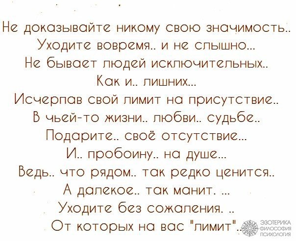 Те эмоции, в которых мы находимся, когда речь идёт о расставаниях, не дают нам узреть более глубокие смыслы происходящего. Меж тем, человек что был рядом, возможно самой судьбой нам был послан для решения определённых задач. Мы их решили и разошлись. А если не решили, значит будет другой «учитель», который точно так же придёт «по судьбе».