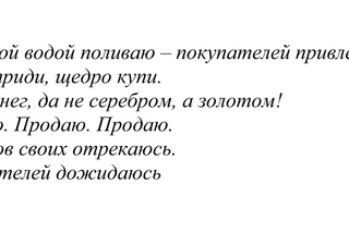 «Благовест возвестил о чуде. Благовест людей в храмы ведет, а мой заговор в мою лавку народ призовет. Во имя Отца и Сына и Святого Духа. Ныне и присно и во веки веков. Аминь».