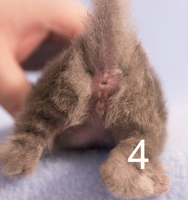 У самки отверстие гениталий выглядит как вертикальная щель. Зона, разделяющая анальное отверстие и вульву, лишена шерсти и очень короткая (у новорожденной кошки – всего от 3 до 5 мм).