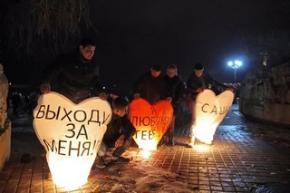 Предложите возлюбленной заглянуть на сайт. - Во дворе, где живет любимая, организуйте настоящий флэш-моб. Для этого привлеките друзей и родственников. Подготовьте соответствующие плакаты и фотографии. Составьте из людей живое сердце, встаньте в середину с кольцом и розой в руку, сделайте предложение.