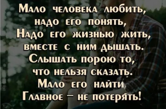 Вообще любовь выражается не в словах, а в поступках. Если ты действительно любишь человека, то можешь пожертвовать ради него временем, вниманием, деньгами, силами. Но и говорить о своих чувствах тоже не надо стесняться. Удивительно, как три простых слова могут изменить жизнь двух людей. Помните, как у Рождественского: