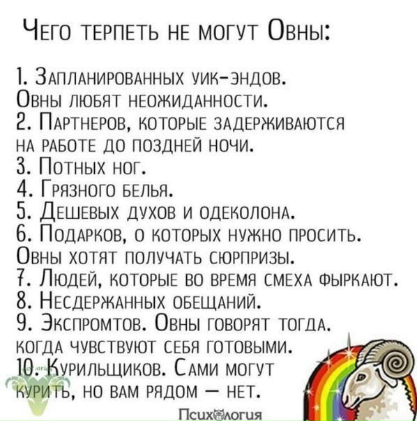 Однако не стоит переусердствовать с лестью, поскольку Овны и так высокомерны. Если девушка не готова терпеть эгоистичность, прямолинейность, импульсивность, то представитель этого знака – не тот мужчина, который сделает её счастливой.