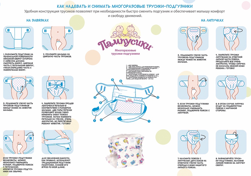 - Тканевые подгузники — это многоразовые, пригодные для машинной стирки альтернативы одноразовым. Обычно они универсальны для всех, от 6 до 35 фунтов, потому что у них есть встроенные регулируемые защелки.