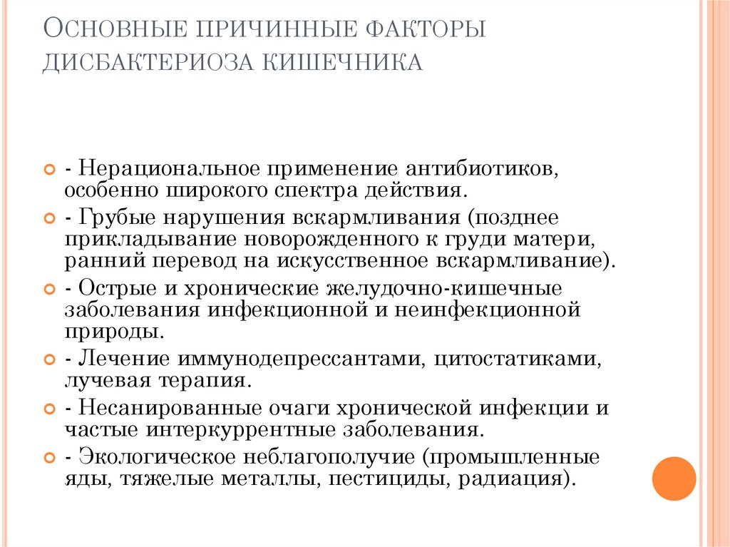 Причиной недуга могут выступать различные заболевания. Как правило, это инфекционное или воспалительное поражение слизистой, эрозия и полипы, а также нарушение работы органов желудочно-кишечного тракта (панкреатит, гастрит, гепатит и др.). Привести к дисбактериозу способно нарушение метаболизма и болезни органов эндокринной системы, в частности, щитовидной железы. Провоцирующим фактором может послужить сильный психологический стресс, эмоциональное потрясение или нервное напряжение.