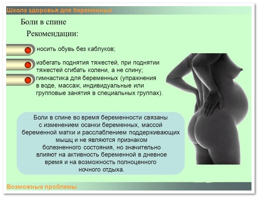 «Вдобавок к этому прибавка в весе, вес и положение растущего ребенка, а также изменения позы, связанные с изменениями центра тяжести (из-за растущего живота), — все это способствует боли в пояснице», — говорит она.