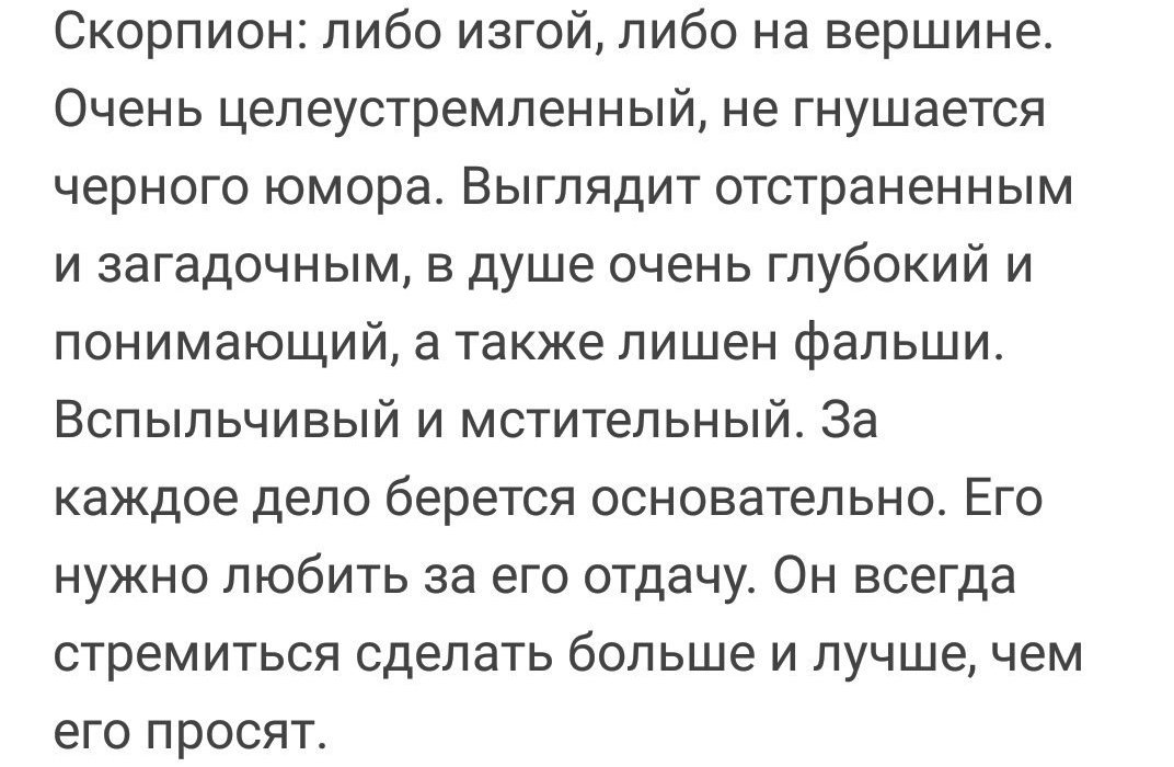 Терпелив, когда ему это необходимо. Скорпиона трудно понять с первого взгляда, поверхностного общения будет недостаточно, чтобы постичь его глубокую эмоциональность. Скорпион всегда ищет полноты ощущений, стремится превозмочь пограничные состояния психики и тела, чтобы победить несовершенство человеческой природы.