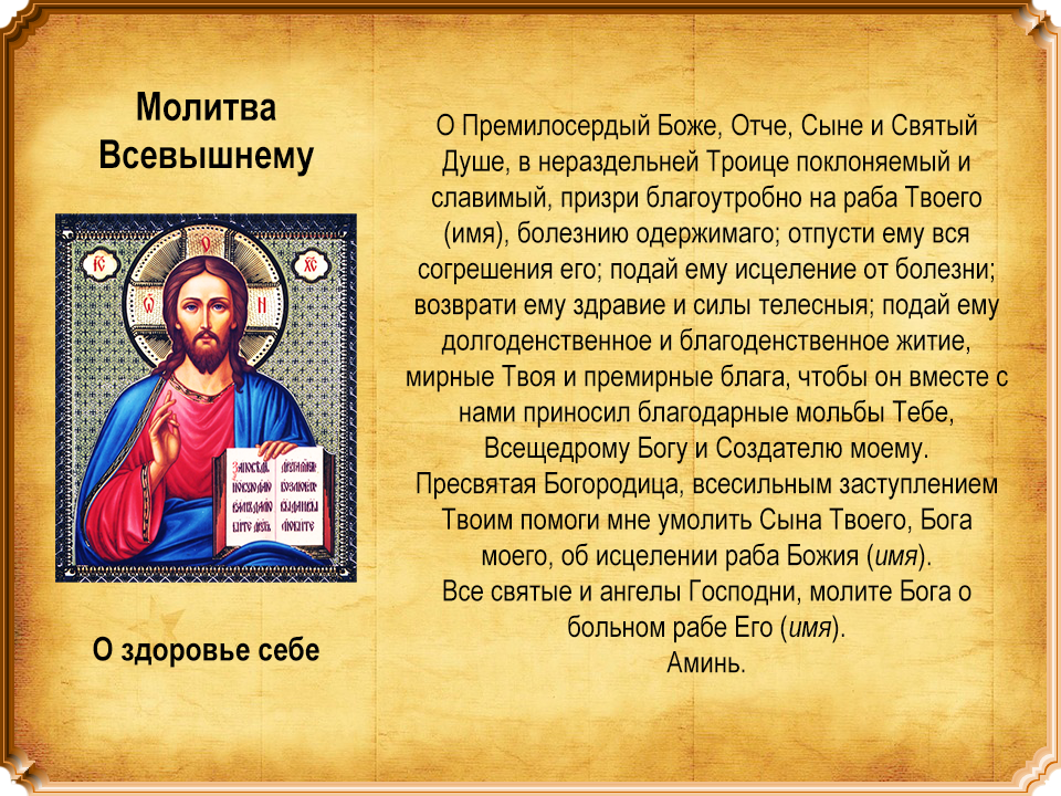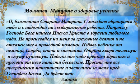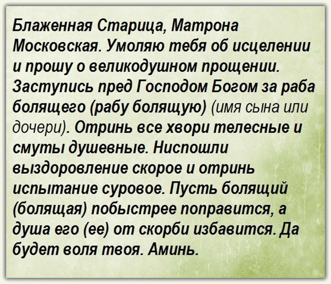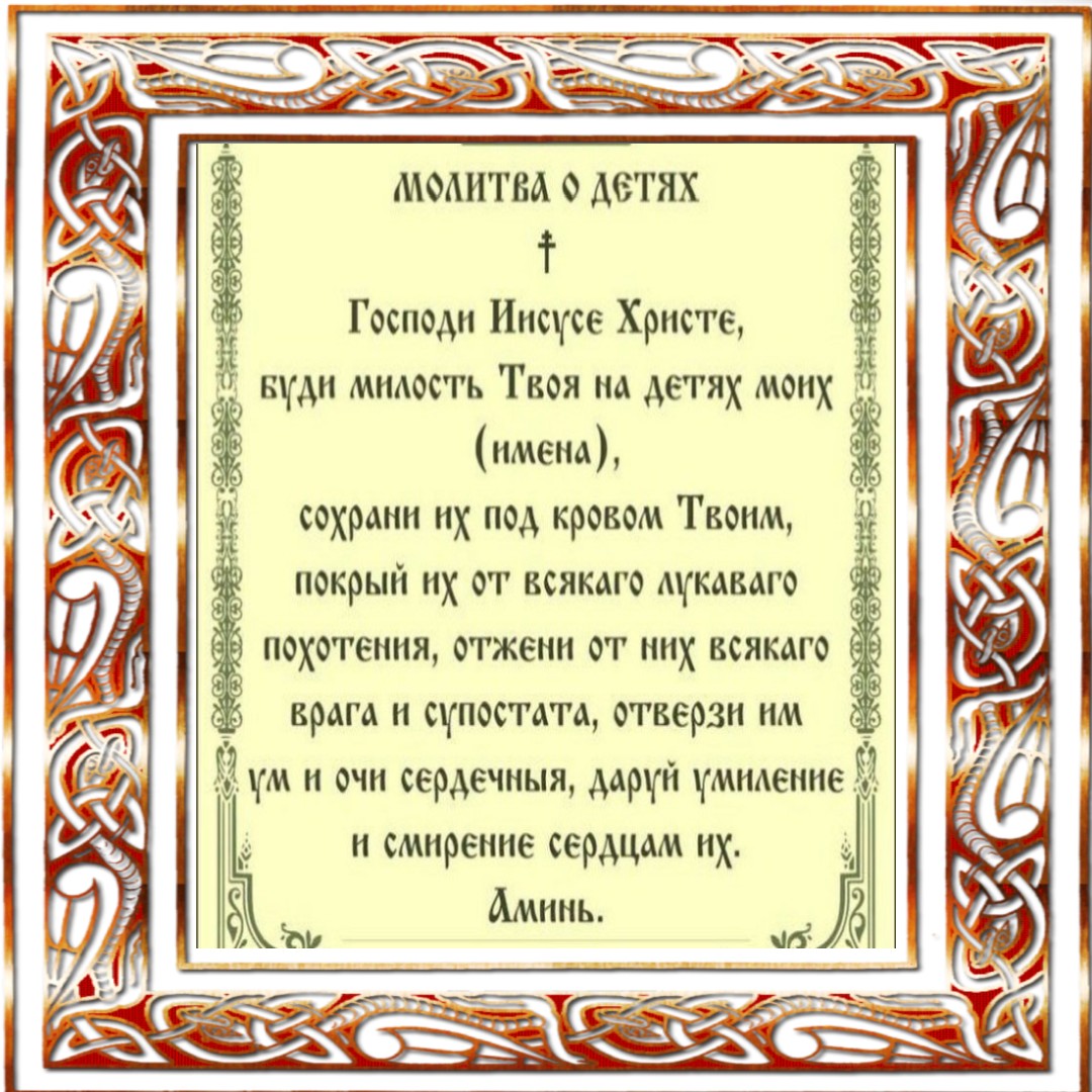Господи Боже мой Всемогущий! Исполни просьбу ничтожной рабы Твоей (ваше имя)! Да пусть прибудет в милости Твоей величайшей чадо мое любимое, Огради ее от сил темных, горя и зла, даруй благо на все дела ее! С глубоким верованием в силу Твою взываю о помощи, Смилуйся, да будет воля Твоя благосклонна ко мне, аминь.