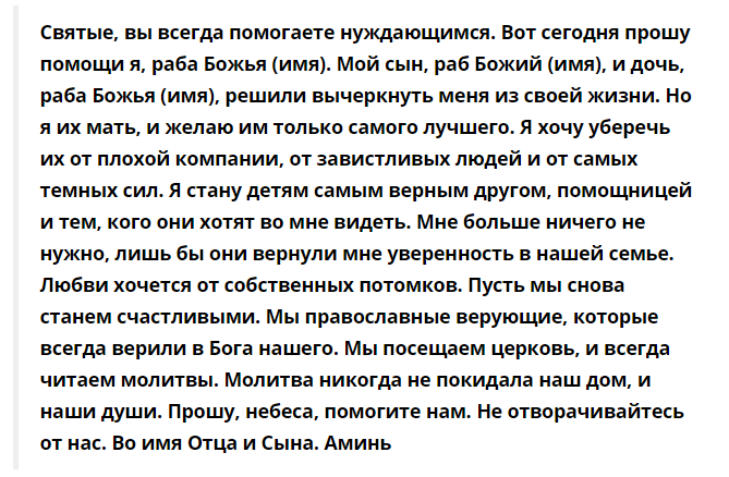 В результате, чтобы дети почитали родителей, как того требуют принципы семьи, необходимы настоящая любовь и терпение. В этом могут помочь специальные молитвы, которые сделают так, чтобы дети не забывали родителей и не обижали их.