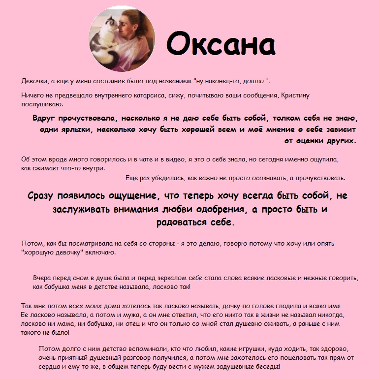 Я люблю и не люблю…Умею и не умею…Разве Кошечка может все это?». То есть человеку предлагается какой-то образ, а он отвергает его: «Нет, я именно такая, какая есть, и принимать меня нужно такой».