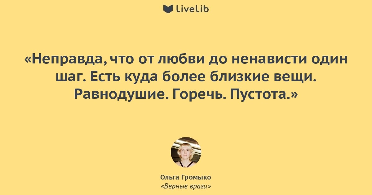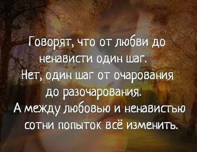 Ненависть имеет много схожего с любовью. В этом смысле от любви до ненависти — один шаг. Ненависть и любовь — проявление интереса, не безразличия. Когда наступает безразличие, уже нет ни любви, ни ненависти.