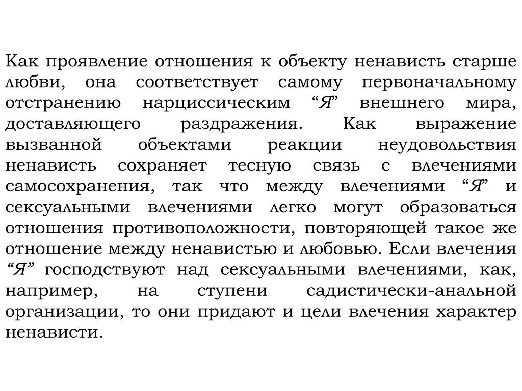 Любовь и ненависть Принято считать, что эти два понятия полностью противоположны друг другу и являются антонимами. Однако в различных культурах мира эти эмоциональные явления неразрывно связаны и представляют собой некое единство. Любовь и ненависть могут одновременно сочетаться в человеке по отношению к предмету его чувств. О двойственной природе этих эмоций говорил еще Фрейд. Психоаналитик считал, что в близких отношениях неизбежно возникают конфликты, порождаемые различными противоречиями. Некоторые этологи утверждают, что одновременное проявление ненависти и любви связано с психическими и физическими механизмами, обеспечивающими и людей, и животных способностью к глубоко личным отношениям и естественной склонностью к агрессии.
