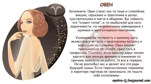 Он высоко ценит вашу мягкость и женственность, а со своей стороны дает брутальность и мужественность. Вряд ли такой мужчина станет посвящать вам стихи и петь серенады. - Жаловаться. Просто не грузите парня разочарованиями и проблемами. Овен очень оптимистичный знак и высоко оценит вашу жизнерадостность.