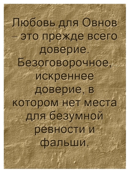 Овен – человек с пламенным сердцем. Он очень искренен и отдается любви целиком. Влюбившись, он не станет скрывать своих чувств или молча страдать, а станет действовать энергично и без промедлений. В ухаживаниях мало кто может сравниться с влюбленным Овном! Он очень романтичен, способен вдохновенно убеждать, проявлять неподдельную заботу и нежность, но главное, что за всеми его словами кроется сила и решимость. Против такого напора мало кто способен устоять. Овен очень верен, и его брак способен продлиться всю жизнь. Единственное, с чем он никогда не станет мириться – это если в семье ему навяжут зависимую, подчиненную роль.