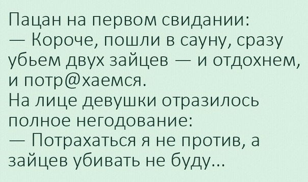 Но она за час встречи рассказала ему все о своих родителях, глупом шефе, неудачницах-подругах. О брате, сестре, домашних животных, любимых курортах и своих хобби. Он сидел и едва сдерживал себя, чтобы не вырубить ее одним ударом.Девочки, иногда лучше жевать, чем говорить. Давайте будет сдержанными. Я понимаю, что зачастую это нервное. Что ты не знаешь, что делать, как себя показать, и начинаешь нести всякую чушь. Закрывай себе рот, милая. Иначе он в твоей жизни больше не появится.