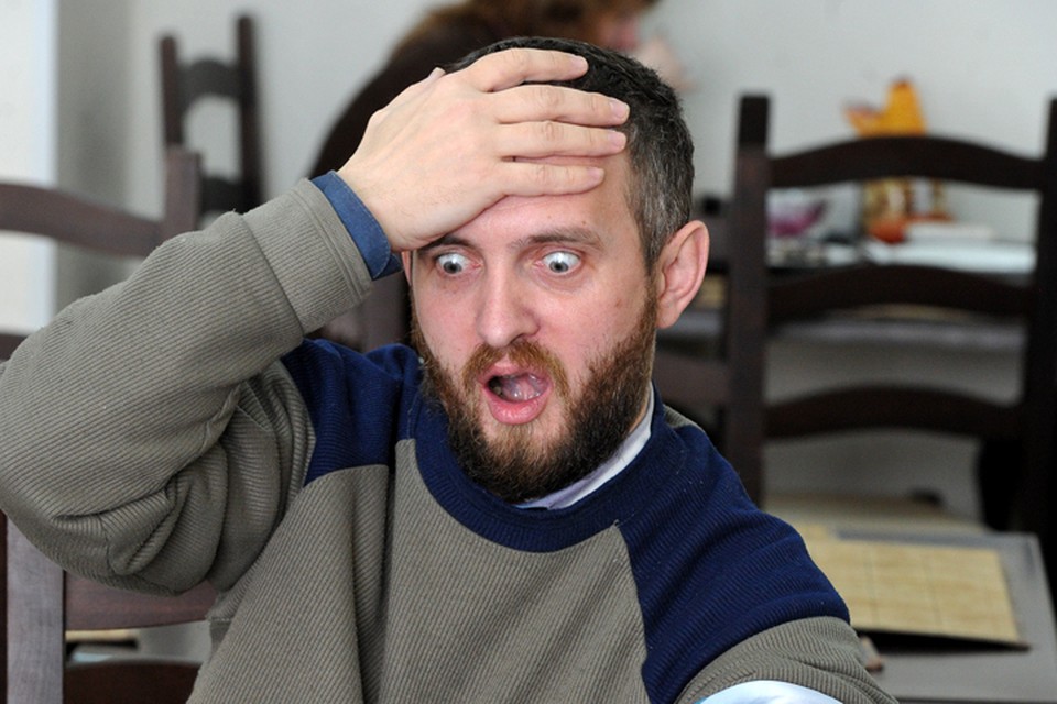 он заботится, человек нюхает пальцы, плохо пахнет, мужчина встает