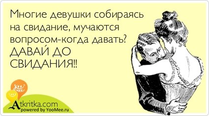1. Женщина хохочет, мужчина не хочет. Старый добрый юмор тебе в помощь: анекдоты, веселые рассказы из опыта подруг, шуточки гарантированно остудят твоего кавалера, особенно, если его намерения весьма серьезны. Он зовет тебя «в уголок», а ты хихикаешь над этим, подтруниваешь, балагуришь — он в ступоре! И хоть ученые говорят, что эндорфинная природа секса и смеха приблизительно одинакова, юмор — коварный враг для близости. Выгода этого метода в том, что когда ты весела и легка, мужчина сохранит к тебе симпатию.