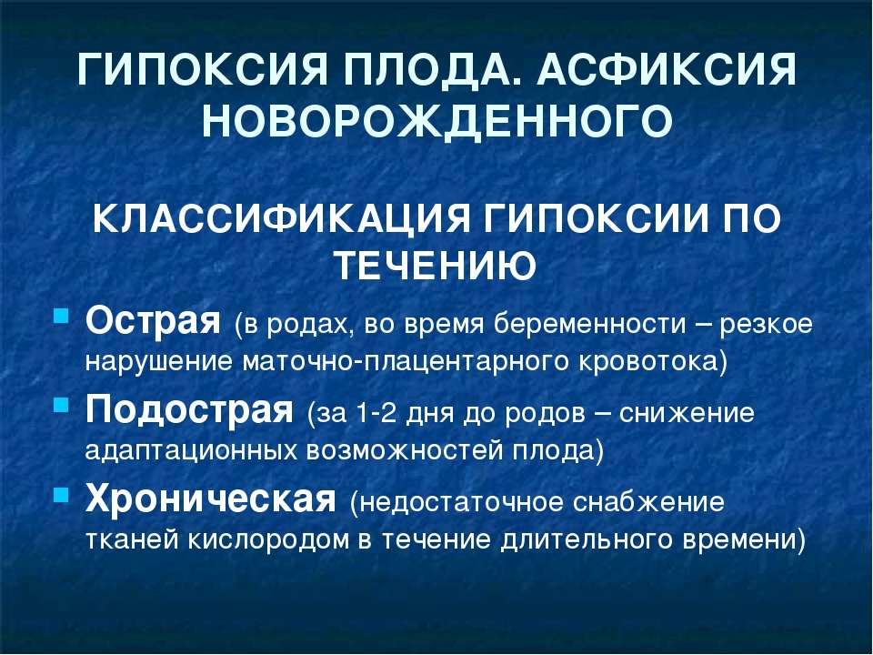 По времени течения и скорости возникновения выделяют острую и хронически развивающуюся гипоксию плода.