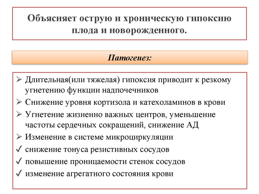 С учетом компенсаторно-адаптационных возможностей плода гипоксия может приобретать компенсированные, субкомпенсированные и декомпенсированные формы. Поскольку при неблагоприятных условиях плод испытывает не только гипоксию, но и целый комплекс сложных нарушений обмена, в мировой практике данное состояние определяется как «дистресс-синдром», который подразделяется на дородовый, развившийся в родах и респираторный.