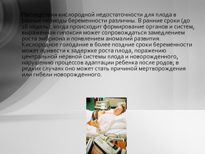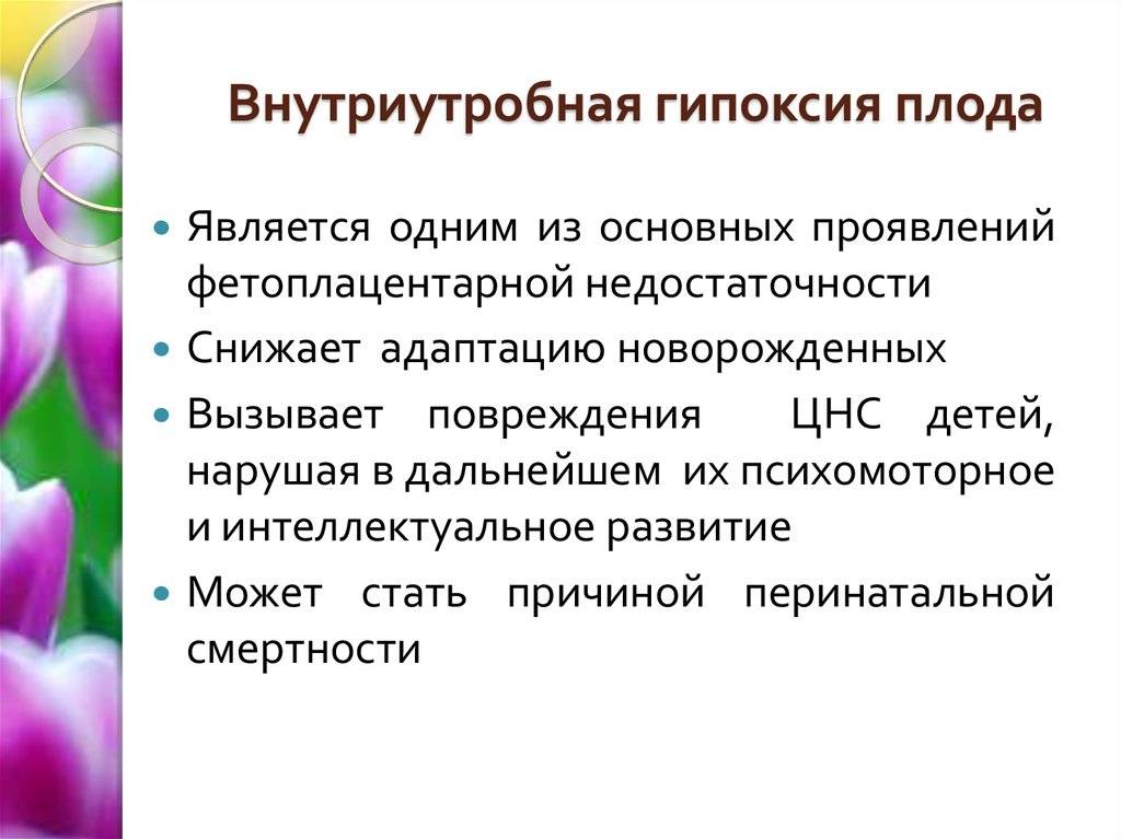 Гипоксия плода на ранних сроках беременности замедляет развитие эмбриона и часто вызывает различные отклонения в развитии и жизнедеятельности. Гипоксия, развивающаяся на поздних сроках чревато поражением нервной системы, задержкой роста плода, а также снижением адаптационной функции ребенка.