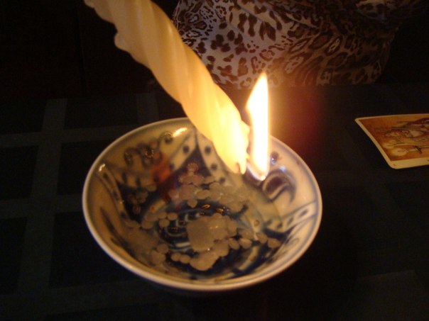 Одну свечу называют своим именем, вторую — именем мужа, после чего их свивают вместе и зажигают. Тут же следует соединить и шарики из теста, в процессе их вымешивания надо говорить: