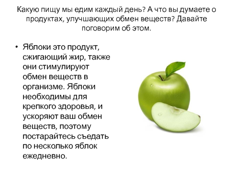 Кроме того, процесс переваривания яблок требует больше энергии, что значительно повышает обмен веществ.