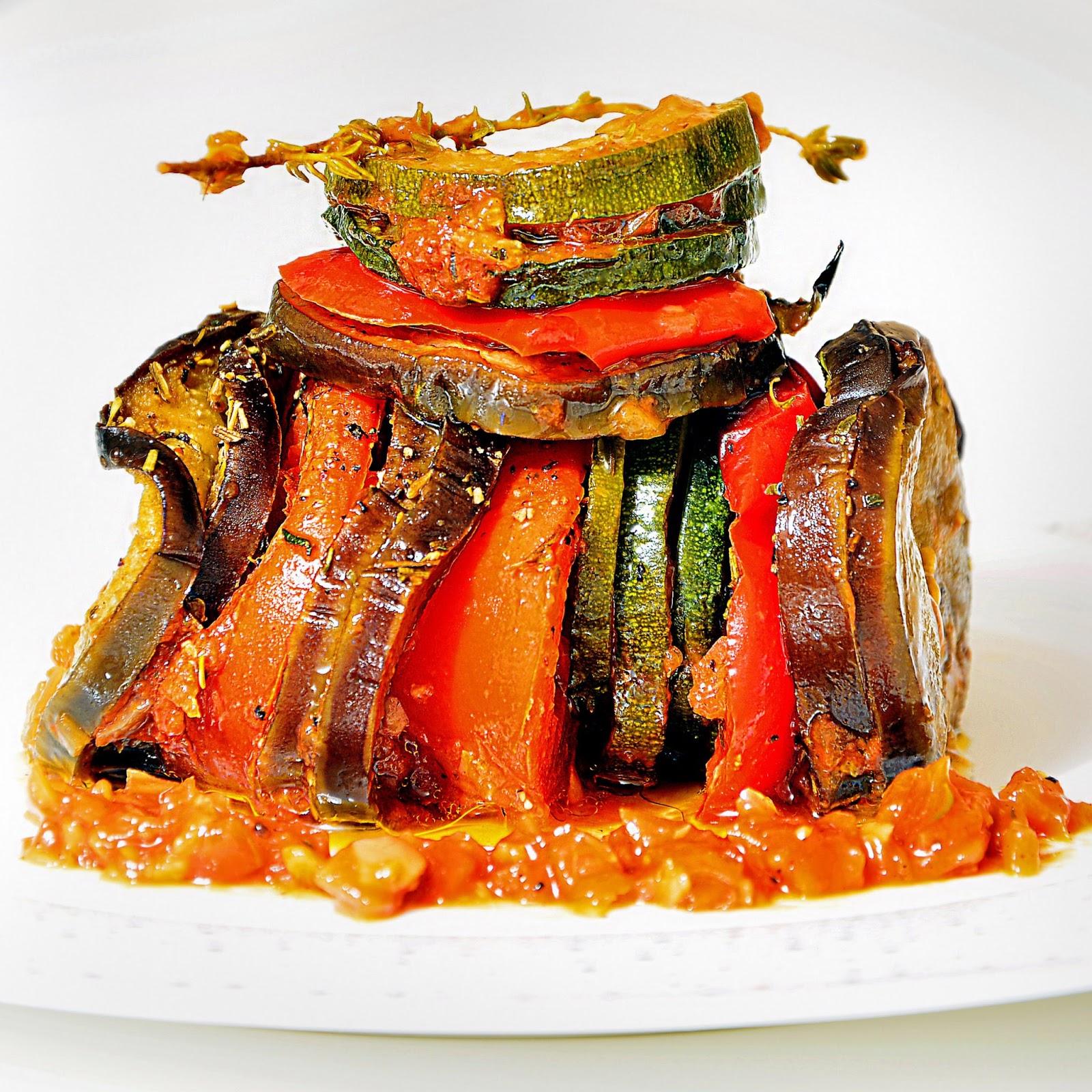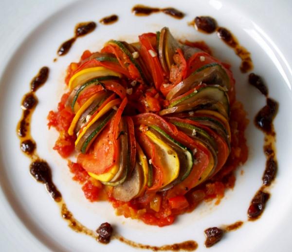 Согласно Википедии, эта причудливая версия традиционного рататуя была впервые создана французским шеф-поваром Мишелем Гераром. Он включает в себя приготовление очень тонко нарезанных овощей на смеси болгарского перца и помидоров, называемой пипераде, а затем запекание в духовке в течение 2,5 ЧАСОВ.