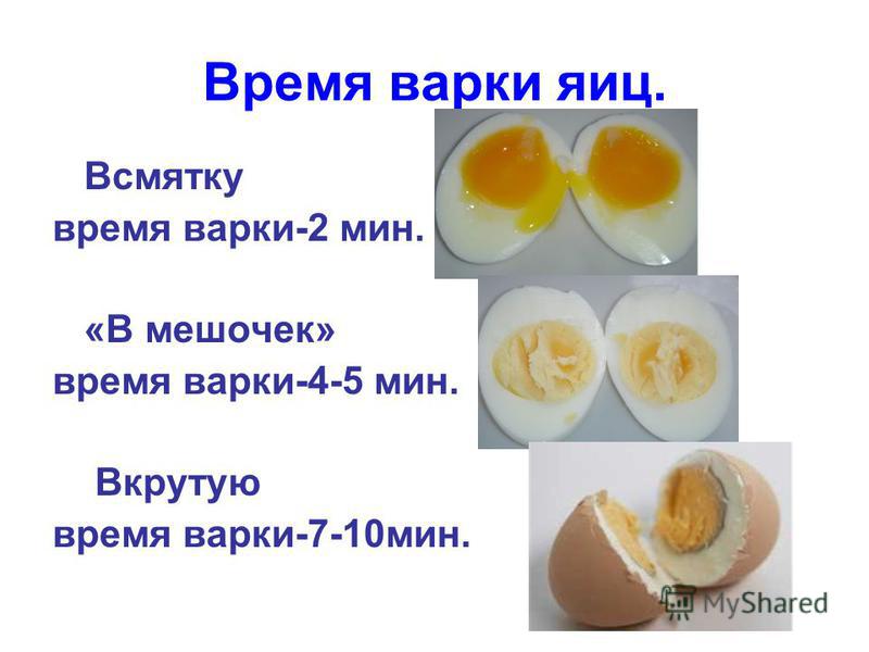 Π£ΡΡΠ°Π½ΠΎΠ²ΠΈΡΠ΅ ΡΠ°ΠΉΠΌΠ΅Ρ ΠΈ Π³ΠΎΡΠΎΠ²ΡΡΠ΅ ΡΠΉΡΠ° Π²ΡΠΌΡΡΠΊΡ 6β7 ΠΌΠΈΠ½ΡΡ, Π° ΡΠΉΡΠ° Π²ΠΊΡΡΡΡΡ β 12β14 ΠΌΠΈΠ½ΡΡ. Π‘ΠΌ. ΠΏΡΠΈΠΌΠ΅ΡΠ°Π½ΠΈΡ ΠΎ Π²ΡΠ΅ΠΌΠ΅Π½ΠΈ ΠΏΡΠΈΠ³ΠΎΡΠΎΠ²Π»Π΅Π½ΠΈΡ Π²ΡΡΠ΅.