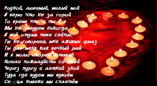 )) — С Добрым утром, мой любимый, мой родной, неповторимый, моя радость… я тебя очень-очень-очень… сильно-сильно-сильно… люблю, поскорей бы наступил тот момент, когда мы увидимся, родной мой, как же я соскучилась…