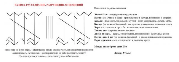 «Данная руническая формула уничтожает отношения между (имена партнеров) превращая их в пепел. У (имена) нет больше ничего общего. ДРС начинает действовать с момента нанесения на фото, активируется огнем и действует до тех пор, пока я не отпущу его сжиганием с благодарностью. Формула действует без вреда для меня, моего здоровья и благосостояния. Да будет так».