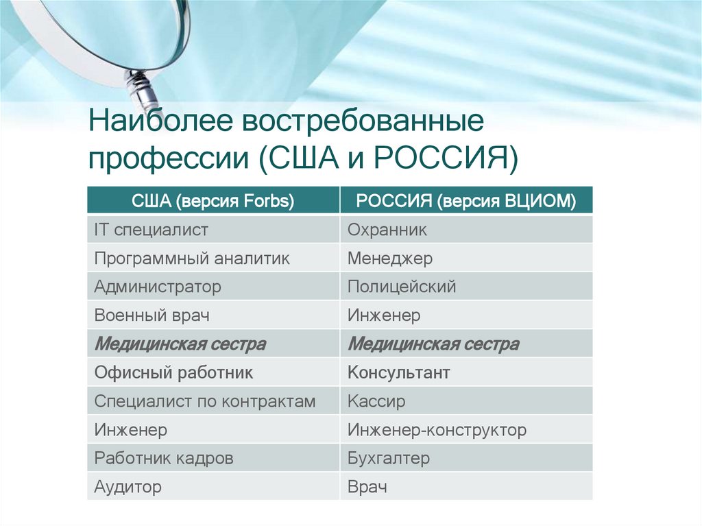 Предлагаем вниманию перечень самых востребованных профессий России. Многие из них, по прогнозам специалистов, будут пользоваться не меньшей популярностью и в ближайшие десятилетия.