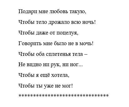 Получив такое, он будет думать о тебе весь день и рваться в твои пылкие объятия. Можно сопроводить сообщение фотографией с намеком на интим (части тела в белье, ножки в чулках).