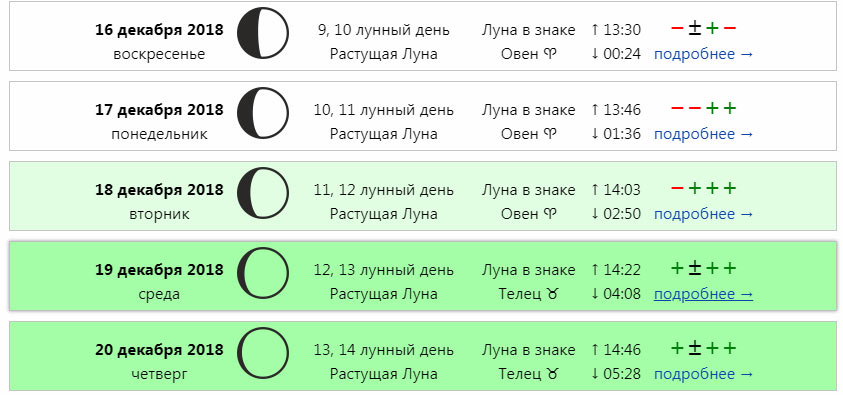 знак, в котором находится Луна, элемент знака, характер знака, фазу Луны (первая, вторая, третья, четвертая или новолуние/полнолуние) и время смены луны или фазы.Ежегодная Книга Знаков Луны Ллевеллина также включает аспектарий с аспектами (или углами) Луны по отношению к другим планетам. Таблицы Луны Ллевеллина предоставляют благоприятные и неблагоприятные аспекты, так что вы можете избежать выбора дат для деятельности, когда Луна находится в неблагоприятном аспекте.