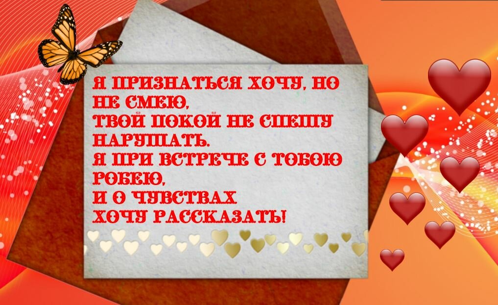 Ты всегда внимательный, добрый и заботливый. Господь наградил тебя такой красотой, что краше тебя нет никого в мире. Если бы я была поэтессой, я бы воспела твой благородный образ. Уже давно между нами порхает проворный Амур, бросая стрелы любви в наши с тобой сердца. Мы с тобой две половинки одного целого счастья. Мой нежный, любимый я признаюсь тебе в любви, и хочу, чтобы отношения наши были взаимны. Я подарю тебе всю свою нежность, ласку и любовь. Я сделаю тебя самым счастливым человеком на свете.