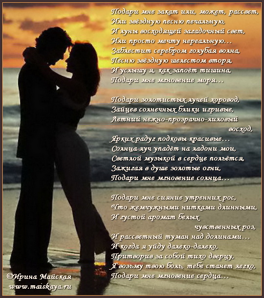 Мой мужчина самый лучший на свете, и это ты, любимый. Как я люблю тебя. Как я люблю твои руки, они как ветер в летний зной, приятно ласкают меня, вызывая мурашки по всему телу. Твои губы, словно вечер, который накрывает город пламенным светом миллионов огней. Я не знаю с тобой, что такое тревоги, что такое обиды и ссоры, что такое сомнения. С тобой рядом я счастлива и любима. Спасибо тебе за это. |