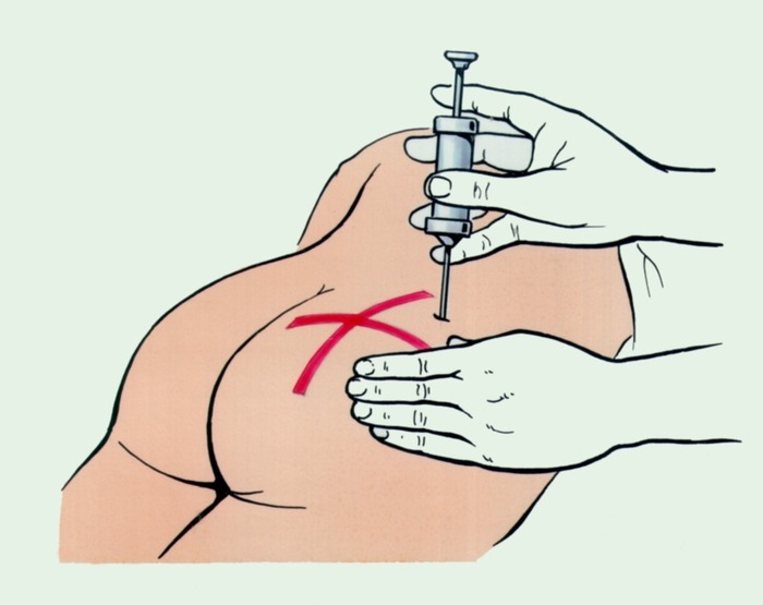 Уколы выполняют в наружный квадрант ягодицы, так, чтобы не задеть седалищный нерв и кровеносные сосуды с большим просветом. Для определения места укола ягодичную мышцу мысленно разделяют на четыре квадрата, из которых выбирают верхний с наружной стороны.