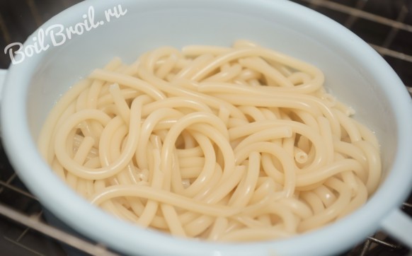 Откиньте спагетти на дуршлаг и промойте их горячей водой, для того, чтобы смыть остатки крахмала.