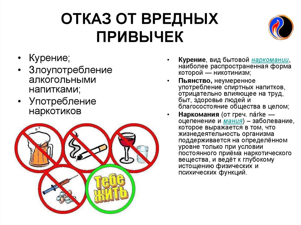 Следующее звено здорового образа жизни — искоренение вредных привычек (курение, алкоголь, наркотики).