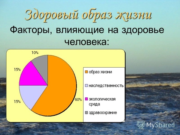 Состояние окружающей среды оказывает большое влияние на здоровье. Вмешательство человека в регулирование природных процессов не всегда приносит желаемые положительные результаты. Загрязнение поверхности суши, гидросферы, атмосферы и океанов сказывается на здоровье людей, эффект озоновой дыры влияет на образование злокачественных опухолей, загрязнение воздуха влияет на состояние дыхательных путей, а загрязнение воды — на пищеварение, резко ухудшает общее состояние здоровья человечества, сокращает продолжительность жизни. Однако здоровье, полученное от природы, зависит только на 5% от родителей и на 50% от условий вокруг нас.